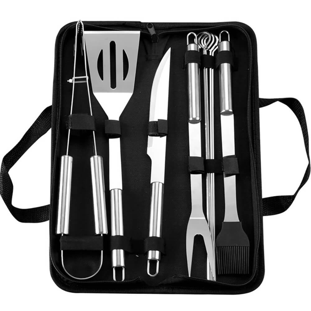 Набор для барбекю и гриля Grill Shef 9 предметов из нержавеющей стали используется для приготовления мяса на природе. Набор для гриля и барбекю поставляется удобном переносном кейсе на молнии и с ручкой. В набор инструментов для барбекю входит 9 предметов – шампуры, щипцы, вилка, лопатка, кисточка, нож. Шампуры с крюками для подвешивания, входящие в набор для гриля, изготовлены из пищевой стали, которая не вступает в реакцию с мясом. Щипцы, которые добавляются в любой набор для барбекю, позволяют переворачивать и удерживать на мангале или гриле мясо, рыбу, овощи. С помощью вилки можно проверить степень готовности, приподнять или удержать кусок при разрезании. Лопаткой легко переворачивать продукты. Набор для барбекю в кейсе выглядит стильно и презентабельно, поэтому отлично подойдет в качестве подарка.
